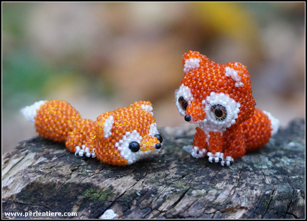 Im Herbst 2025 habe ich 3 neue Waldbewohner gefädelt - Eichhörnchen, Waschbär und Fuchs. Ich habe auch hier wieder ausprobiert, wie die Tiere mit Cabochon-Augen aussehen, deshalb gibt es jedes Tier zweimal. Insgesamt bin ich ziemlich zufrieden, aber alles in Allem mag ich die Wachsperlen-Versionen lieber.
