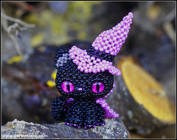 Zuerst hatte ich die Katze mit violetten Augen geperlt, da hier die Augen und die Rocailles für den Hut so gut zusammenpassten. Danach hat sich meine Tochter noch eine Katze mit heterochromen Augen gewünscht. Tadaa!