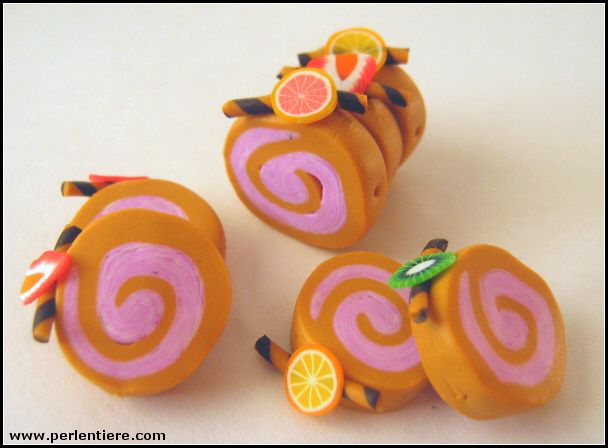| Kommentar: | Diese Biskuitrolle geht recht einfach. Ich habe weiß und rosa mit etwas violettem Fimo gemischt und als Spirale mit gemischtem Beige aufgerollt. In dicke Scheiben schneiden und verzieren - fertig. Für die Deko habe ich kleine Waffelröllchen fimoliert und fertige Obstscheibchen aus meinem Fingernagel-Design-Set genommen. Ich finde die Biskuit-Scheiben toll. |