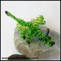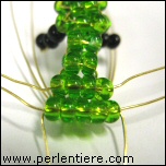 Die Drähte für die Hinterbeine werden auf dieselbe Weise durch die gekennzeichneten Reihen gezogen. Dann arbeitet ihr den Körper ganz normal bis zum Schluss weiter. Wenn ihr die letzte Schwanzperle aufgezogen habt, kommt der Abschluss. Dazu könnt ihr zum Beispiel mit den Drahtenden auf der Oberseite durch die Perlen zurück fädeln. Den Draht nah am Körper mit dem Nagelknipser anzwicken. |