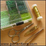 Das Überstehende Stück mit der Pinzette an den Flügel herandrücken. Den zweiten Flügel spiegelverkehrt genauso fädeln. |