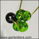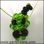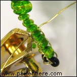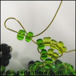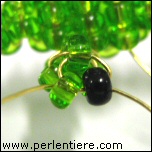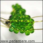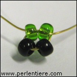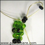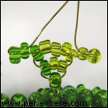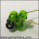 Mit dem vorderen Draht fädelt ihr in dunkelgrün den vorderen Perlenstab aus 2 Perlen. Gut straff ziehen. |