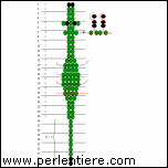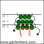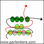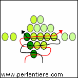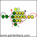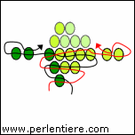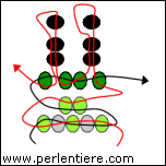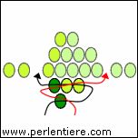 Es folgt die dritte Reihe. Im Anschluss an diese Reihe werden zwei kleine Perlenstäbe gefädelt. |