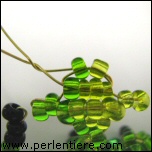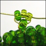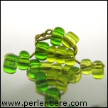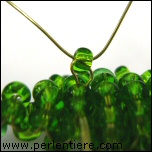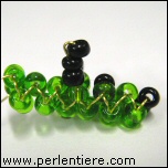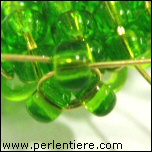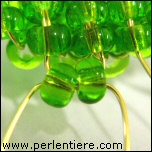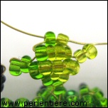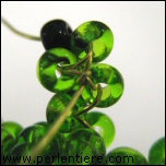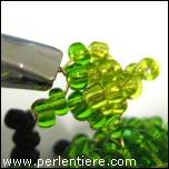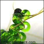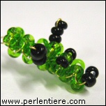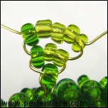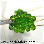 Mit dem hinteren Draht fädelt ihr einen Perlenstab aus hellgrünen Perlen. Ebenfalls gut straff ziehen. |