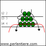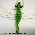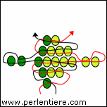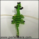 In Reihe 14 wird während des Arbeitsschrittes einer der Extradrähte für die Beine komplett durch die 4 Perlen der Körperreihe gezogen. Die eigentlichen Arbeitsdrähte dann gut straff ziehen. Die beiden Enden des Beindrahtes schauen nun links und rechts aus dem Drachenkörper heraus. |