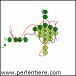 In der nächsten oberen Reihe (Reihe 15) fädelt man beide Extradrähte für die Flügel durch die mittleren zwei Perlen der Reihe. |