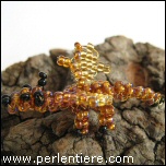 Nach dem Straffziehen sieht der Drachen von oben dann aus, wie auf dem ersten Bild gezeigt. Unten schauen die Beindrähte und oben die Flügeldrähte heraus. In der nächsten Reihe wird ein weiterer Beindraht durch die 5 Körperperlen gezogen, sodass jetzt insgesamt 4 Drähte in den Drachen eingearbeitet sind und 8 Enden herausschauen, wie auf dem zweiten Bild (von unten). |