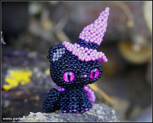 Zuerst hatte ich die Katze mit violetten Augen geperlt, da hier die Augen und die Rocailles für den Hut so gut zusammenpassten. Danach hat sich meine Tochter noch eine Katze mit heterochromen Augen gewünscht. Tadaa!