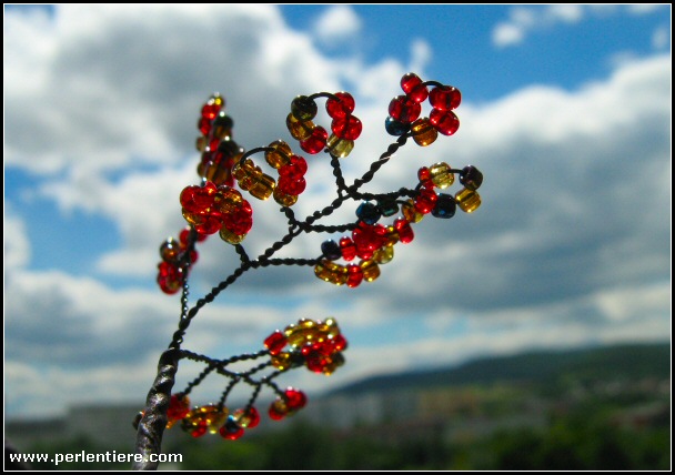 | Kommentar: | Diesen Ahorn habe ich aus einer Mischung aus roten, braunen und anthrazit-irisierenden Perlen gemacht. Ich habe die Äste mal weiter gefächert aneinandergesetzt, um den Eindruck von schon kahler werdenden Ästen anzudeuten. Ich mag die Farben und die Form. Die Perlenmischung schillert so richtig schön in der Sonne. |