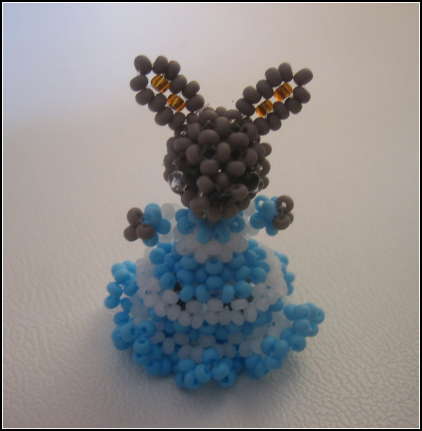 Meine Figur trägt so eine Art glockenförmiges Kleid. Ich habe die Figur ganz bewusst so schlicht gehalten und bis auf die Augen nur mit 2,6 mm-Perlen gearbeitet. Das soll das Unschuldige Wesen der Kleinen zum Ausdruck bringen.